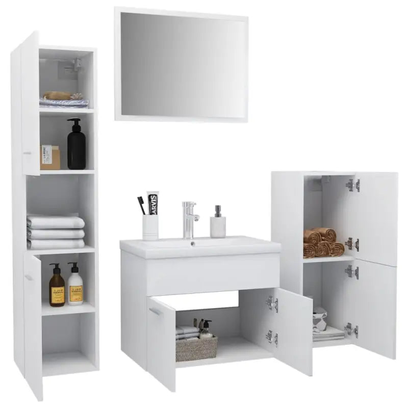 De meubelset bestaat uit een wastafelkast met een wasbak, een lage kast, een hoge kast en een spiegel. De chique wastafelkast heeft 1 vak en past perfect onder je wastafel, waardoor hij heel handig is. De wastafel is gemaakt van keramiek en dient niet alleen als product voor dagelijks gebruik, maar ook als versiering in je leefruimte. Dankzij zijn trendy en eigentijdse ontwerp past deze wastafel beslist in elk interieur. De overloop zorgt ervoor dat de bak nooit kan overlopen. De hoge kast heeft in totaal 5 vakken en 2 deuren, terwijl de lage kast 2 vakken heeft. Deze 2 kasten bieden verschillende opbergmogelijkheden en extra ruimte om spullen in je badkamer op te bergen. De spiegel geeft je interieur een prachtige uitstraling. Deze badkamerset is gemakkelijk schoon te maken met een vochtige doek.