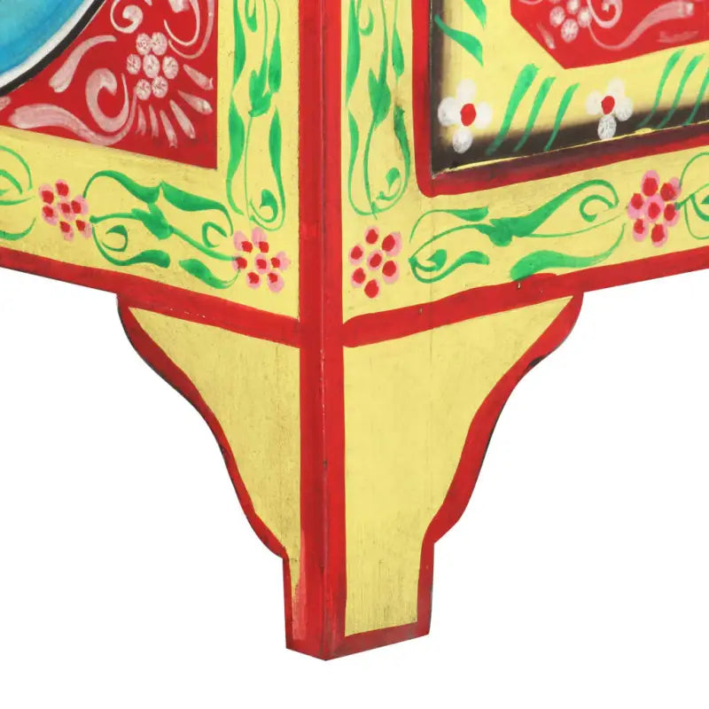 Dit prachtige houten nachtkastje is versierd met rijke, handgeschilderde decoraties. Het is met het kleurrijke ontwerp een opvallende aanvulling op je slaapkamer.
