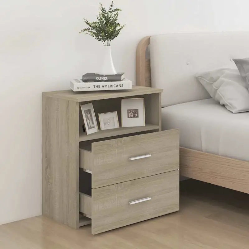 Het nachtkastje is stabiel en stevig. Daarnaast is het uitgerust met 2 lades en een schap, die voldoende opbergruimte bieden om je spullen overzichtelijk en binnen handbereik te houden. Het kastje is gemakkelijk schoon te maken met een vochtige doek.