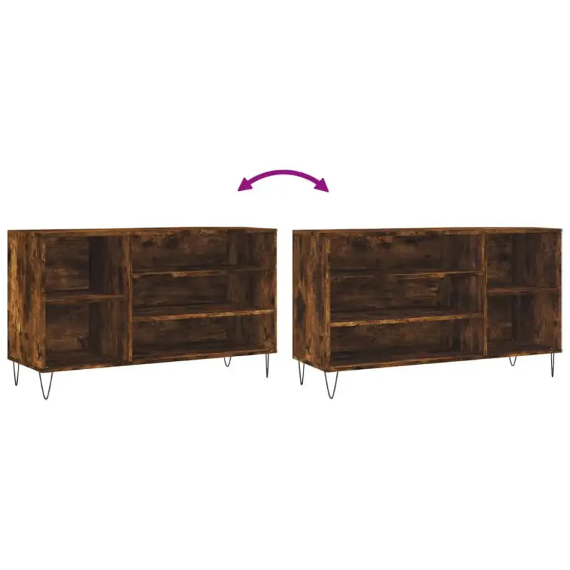 Schoenenkast van bewerkt hout met metalen poten voor een opgeruimd entreegebied
