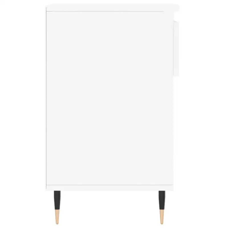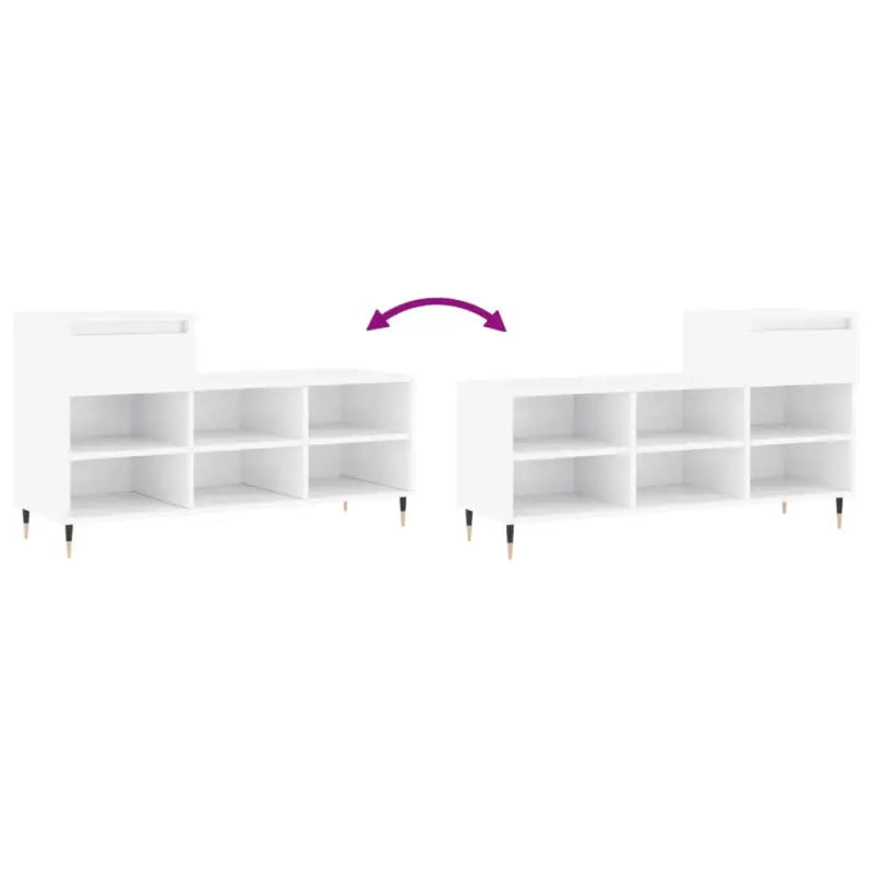 Elegante schoenenkast van bewerkt hout met metalen poten in hoogglans wit