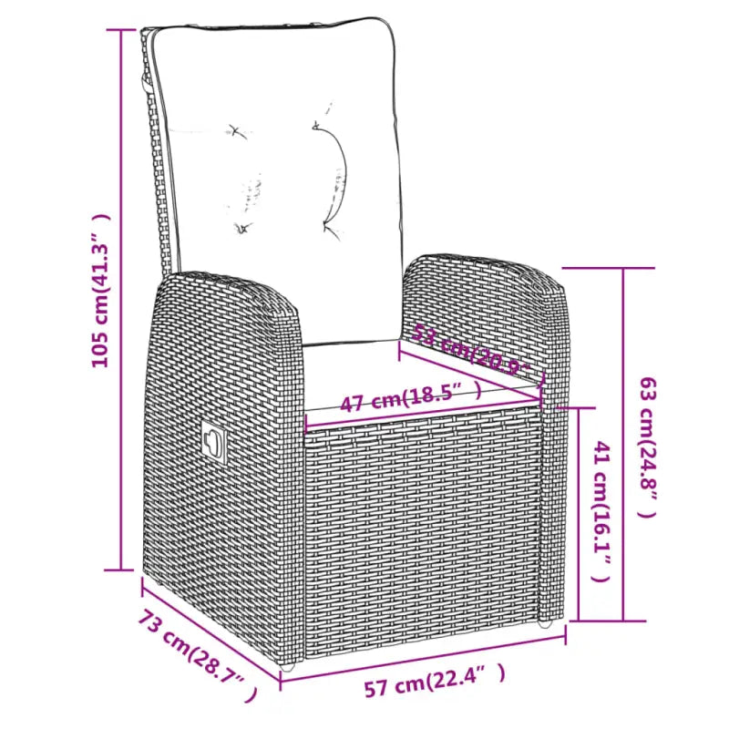 - Afmetingen stoel (normale positie): 57 x 73 x 105 cm (B x D x H)