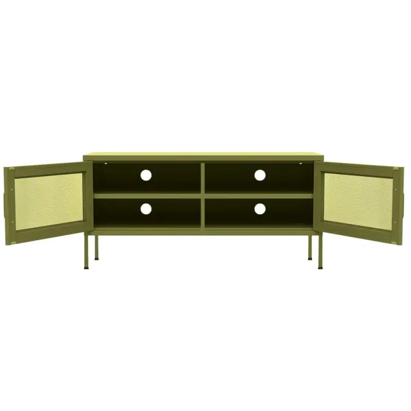 De stalen constructie van deze televisiekast maakt hem zeer stevig en duurzaam. De nivelleerders aan de onderkant zorgen ervoor dat je de hoogte aan je behoeften aan kunt passen. De tv-standaard heeft 2 gaasdeuren met een schap binnenin, die voldoende opbergruimte biedt voor dvd's, tijdschriften en andere spullen. Het achterpaneel heeft 4 gaten om de kabels van apparaten te organiseren. Dit televisiemeubel is gemakkelijk schoon te maken met een vochtige doek.