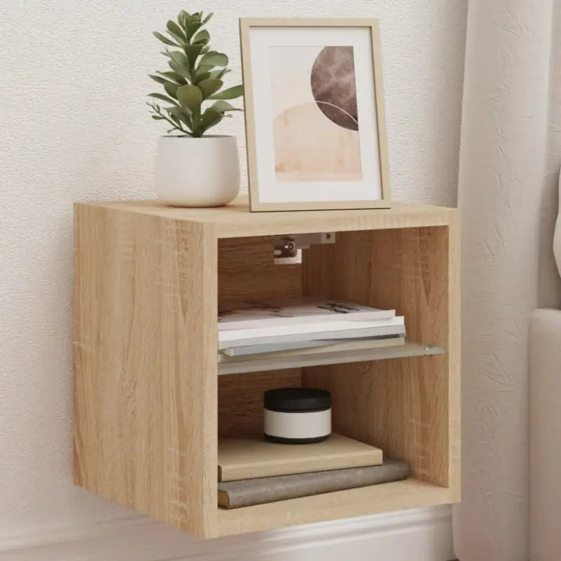 • Voldoende opbergruimte: het tv-wandmeubel heeft een glazen plaat die voldoende ruimte biedt om je kleine spullen zoals boeken, dvd's en tijdschriften netjes geordend en binnen handbereik op te bergen.