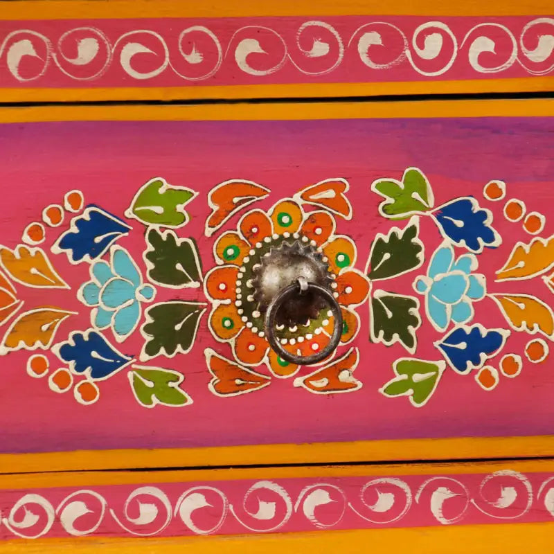 De tv-kast is handgemaakt van mangohout, dat zowel duurzaam als mooi is, en het vakmanschap draagt bij aan de spectaculaire retrostijl. De hifi-kast heeft rijke, met de hand geschilderde decoratieve details die een vleugje elegantie uitstralen en de verfijnde uitstraling benadrukken. De mooie hendels maken het gemakkelijker om de lade en deuren te openen. Daarnaast heeft de kast grendels om de deuren gesloten te houden.